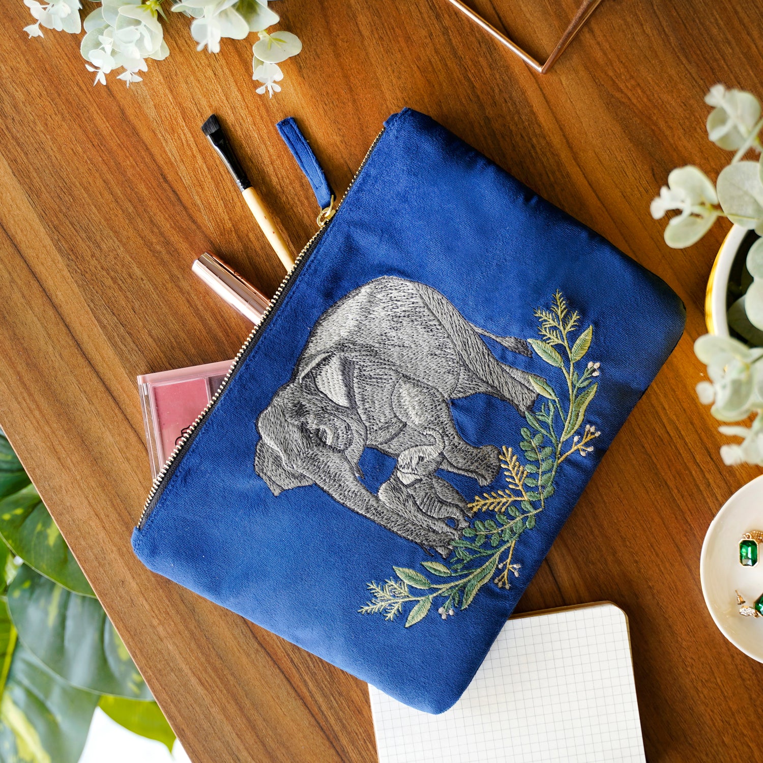 This everyday pouch is crafted from plush velvet and embroidered with striking wildlife motifs—bringing elegance to your daily essentials. Whether used for cosmetics, chargers, or small travel must-haves, it's a functional piece with a meaningful story.