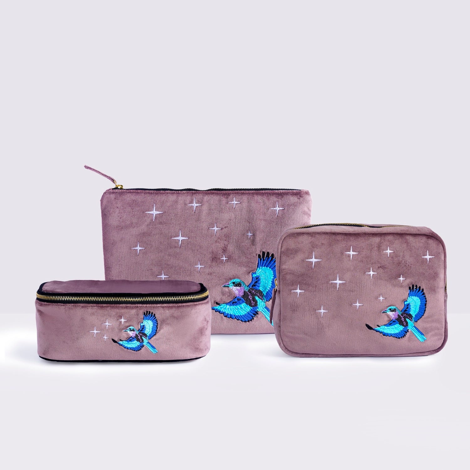 A beautiful trio designed to keep your day beautifully organised. This set features the Everyday Pouch, Jewellery Pouch, and All Day Organiser — each crafted from plush velvet and detailed with delicate wildlife embroidery.