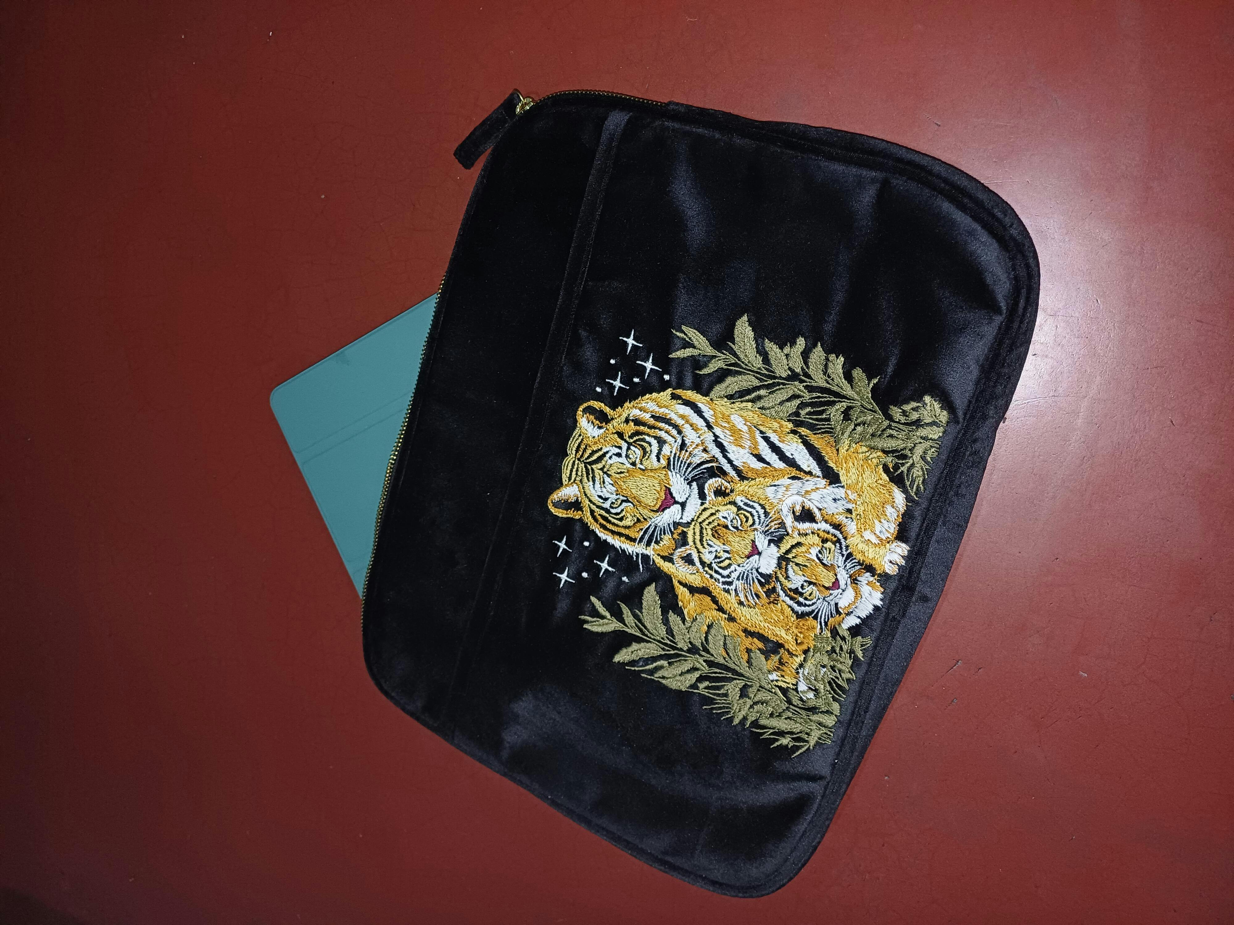 A sleek, stylish duo designed for those who appreciate elegance with a touch of the wild. The laptop sleeve keeps your device secure, while the everyday pouch is perfect for your essentials—both crafted from luxurious velvet with intricate tiger embroidery. Part of the "Whispers of the Wild" series, this set is more than just functional; it’s a statement of conscious luxury. A portion of proceeds supports wildlife conservation, making every purchase a step toward protecting nature.